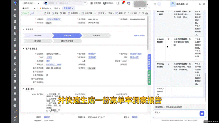 根据规则对商机进行诊断,智能评估客户需求匹配度、赢单概率,给出推进建议,辅助销售团队聚焦高价值客户。