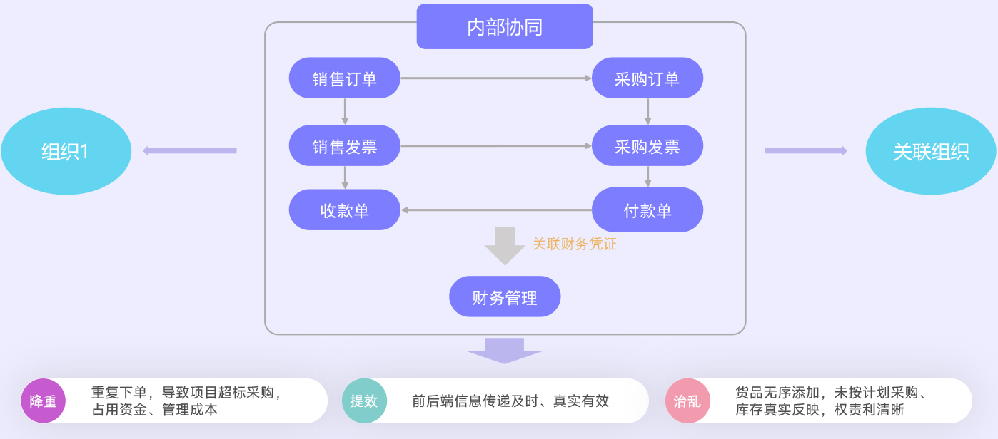 代采公司”等多主体协同场景,企企可自动生成内部订单、发票与往来数据,实现多组织之间的业务联动与核算一致。企业不再需要通过人工沟通或反复核对来确认跨公司的业务关系,大幅提高协作效率,避免重复采购与错账漏账,构建真正统一的集团化项目运营能力。